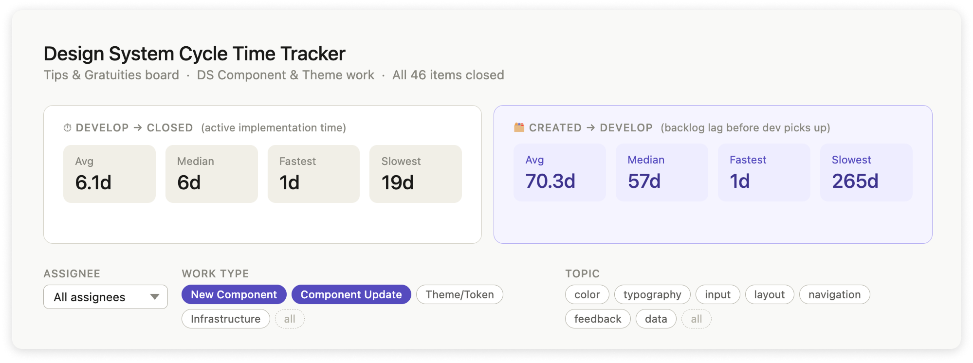 An audit of previous Design System work highlighted that implementation time by developers isn’t necessarily the issue (although, there’s always room for growth); it’s the fact that the work is not prioritized in the first place. On average, this work sits in the backlog for over 2 months!