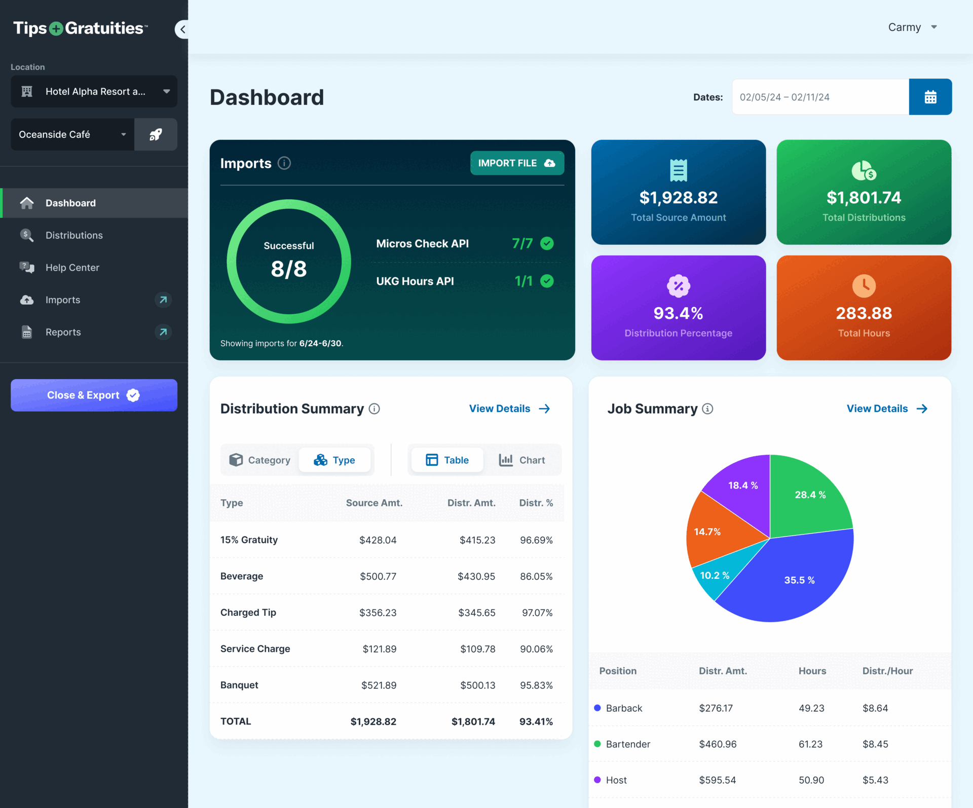 The new Dashboard experience gives users a high level summary of the most important information necessary to closing a pay period and ensuring accurate tip payouts to employees.