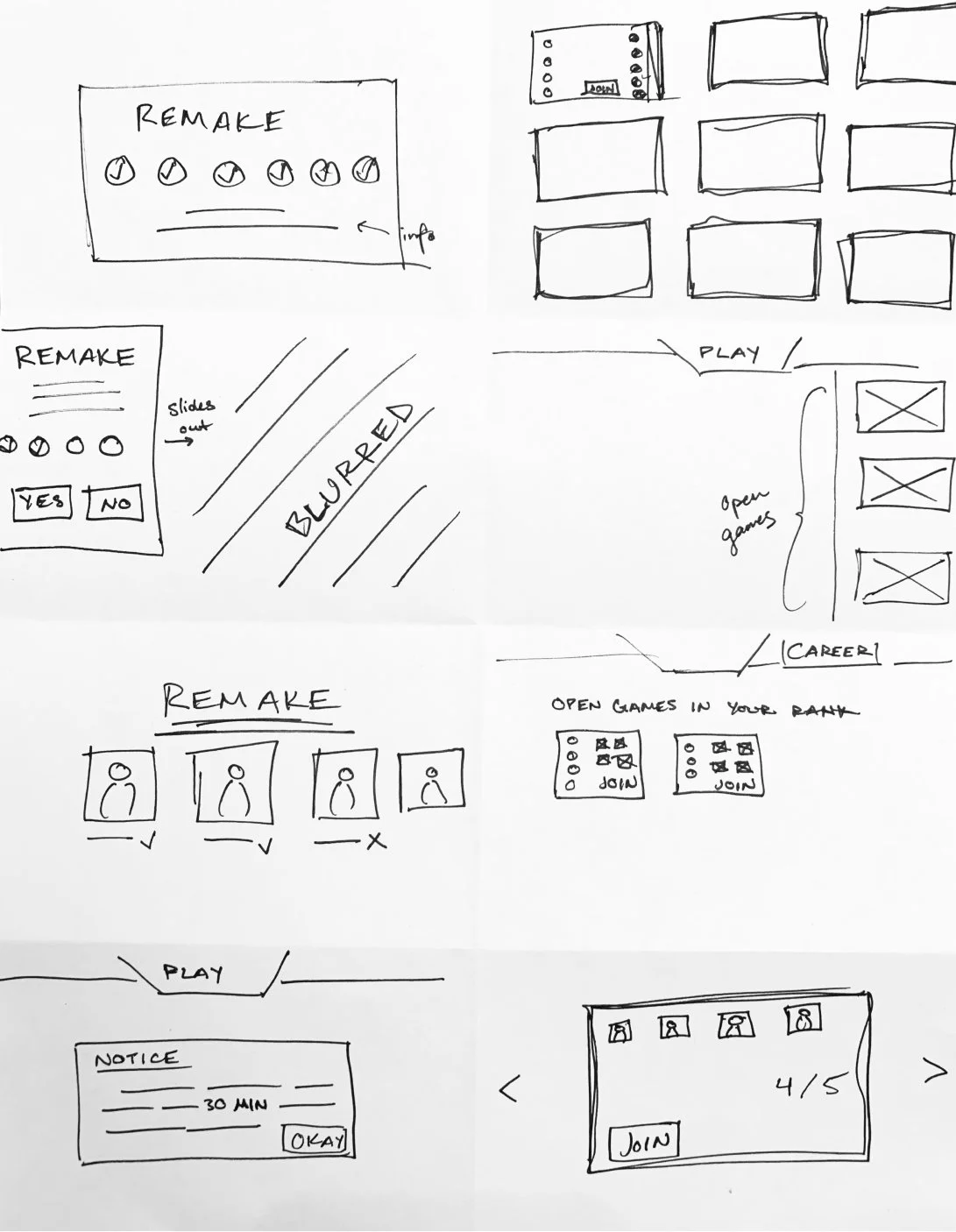 The eight sketches I did pose solutions for a couple of problems identified. One solution is the remake UI (mostly sketched on the left column). The second is letting people join in-progress games (mostly sketched on the right column).